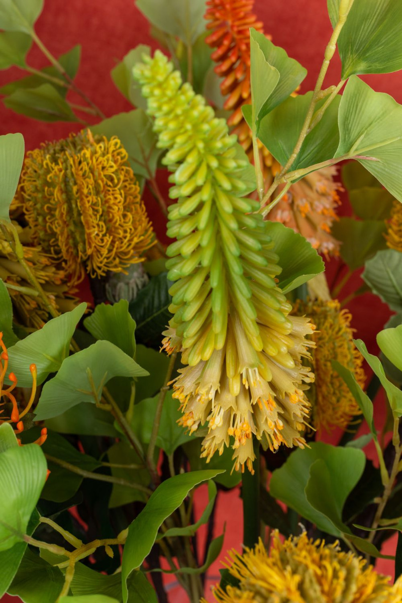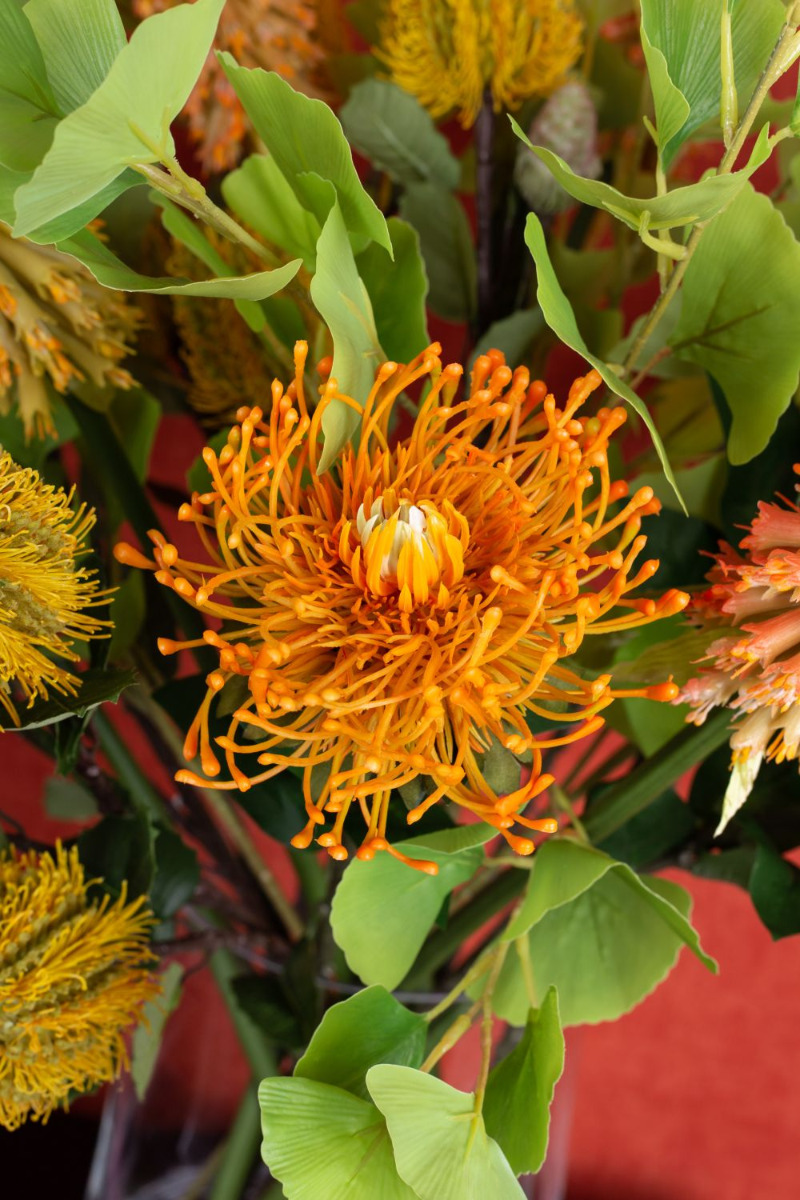 Jaune et orange! Les couleurs de l'optimisme, de la gaieté et de la légèreté. Oui, c'est ainsi que se sent l'été ! En regardant ce bouquet, on a vraiment chaud au cœur, car les sensations estivales reviennent. Les Protea Leucospermum en jaune et orange ont été mélangés à des kniphofias de la même couleur pour créer un magnifique bouquet de fleurs lumineuses. C'est d'ailleurs un cadeau parfait pour une bonne amie, car l'orange est la couleur de l'amitié. Shop the Look!