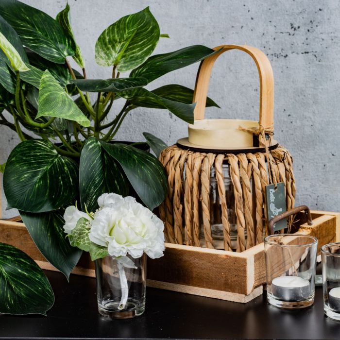 Une agréable soirée d'été ! Avec ce look, tous vos souhaits seront comblés. La lanterne diffuse la douce lueur des bougies, le vert frais du pothos symbolise le calme et la sérénité, mais aussi le renouveau. Vous pouvez placer le piquet soit dans un verre à bougie chauffe-plat avec un peu de granulés, soit entre les feuilles du pothos, ce qui créera un effet intéressant. Disposé sur un plateau, cet ensemble peut être rapidement placé à l'endroit de votre choix. Shop the Look !
