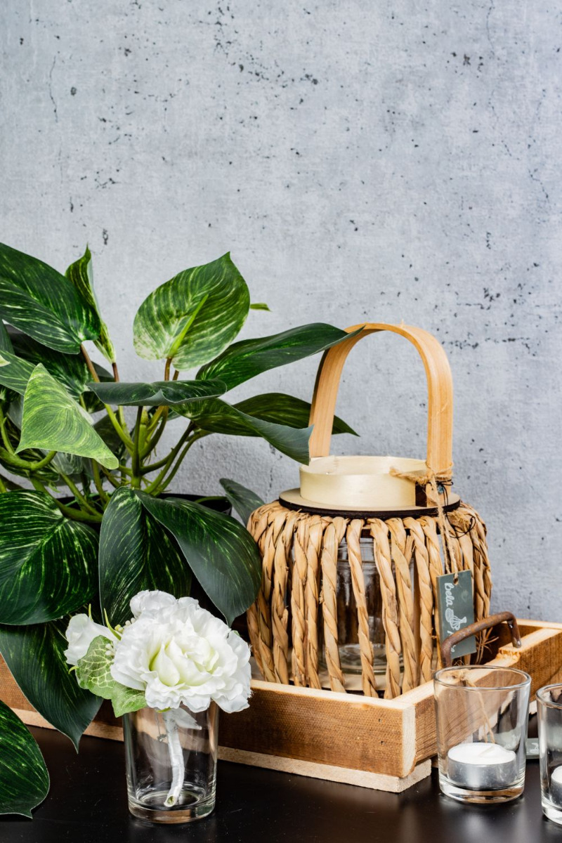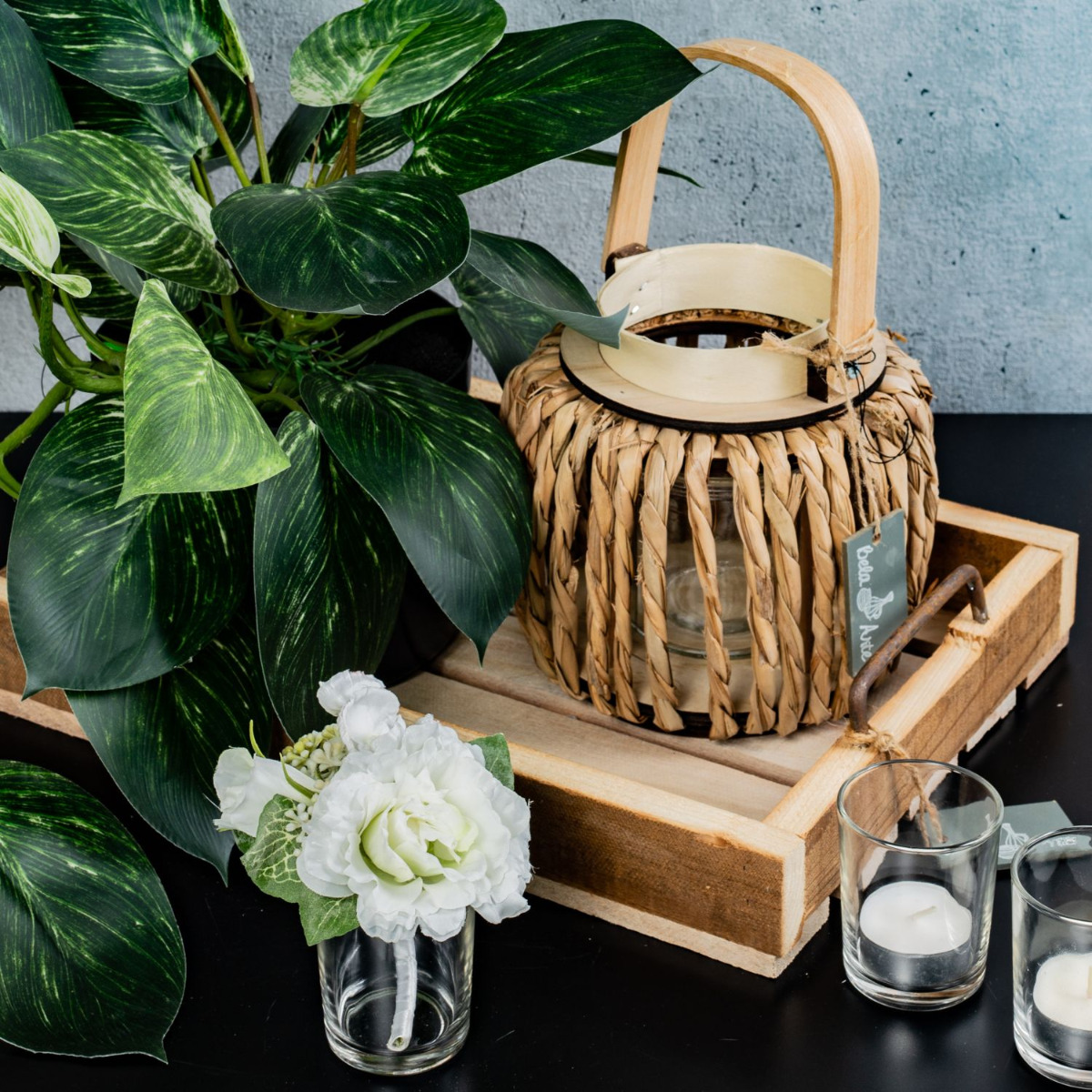 Conseil d'aménagement : placez la plante artificielle et la lanterne sur le plateau et disposez les photophores tout autour.