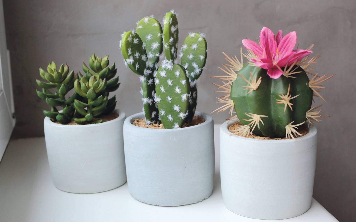 Trois plantes succulentes individuelles en plastique KATIA dans trois petits pots individuels en béton