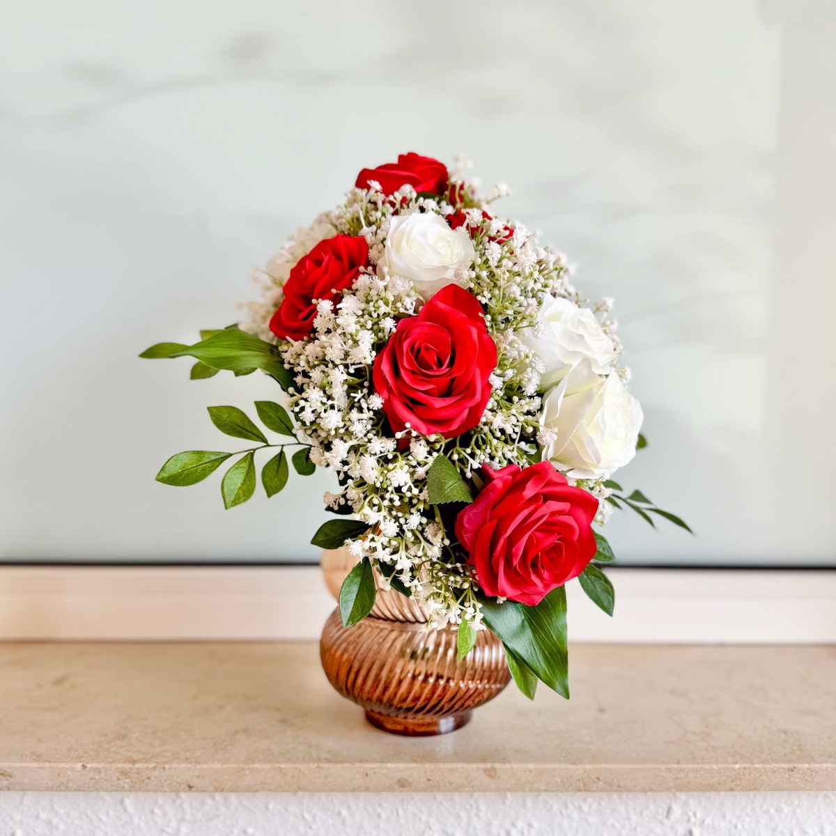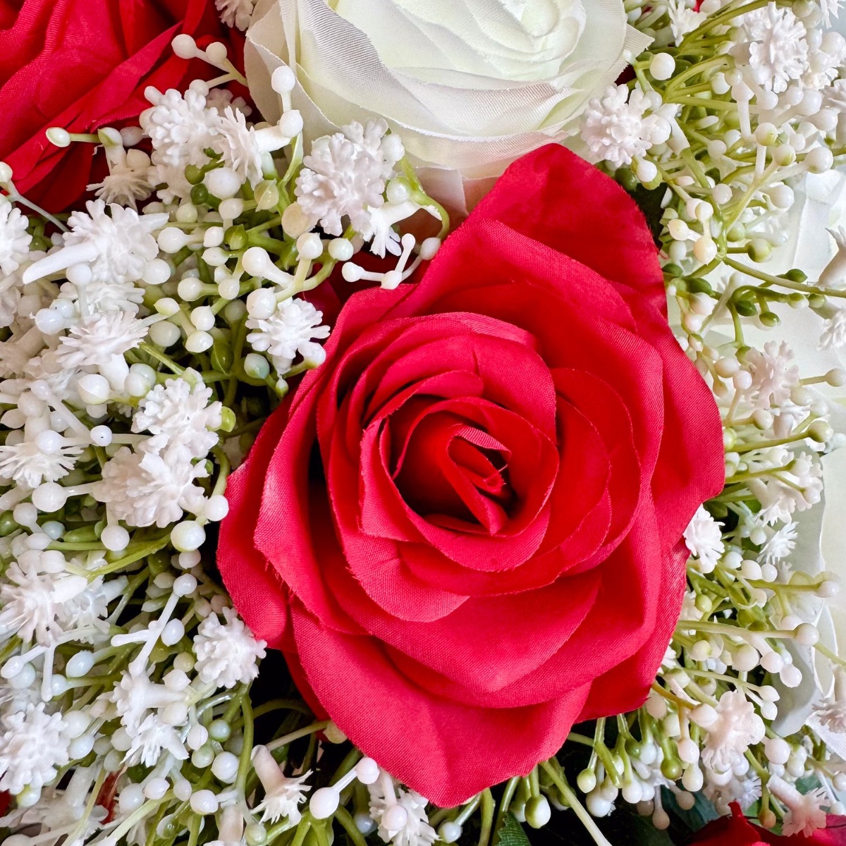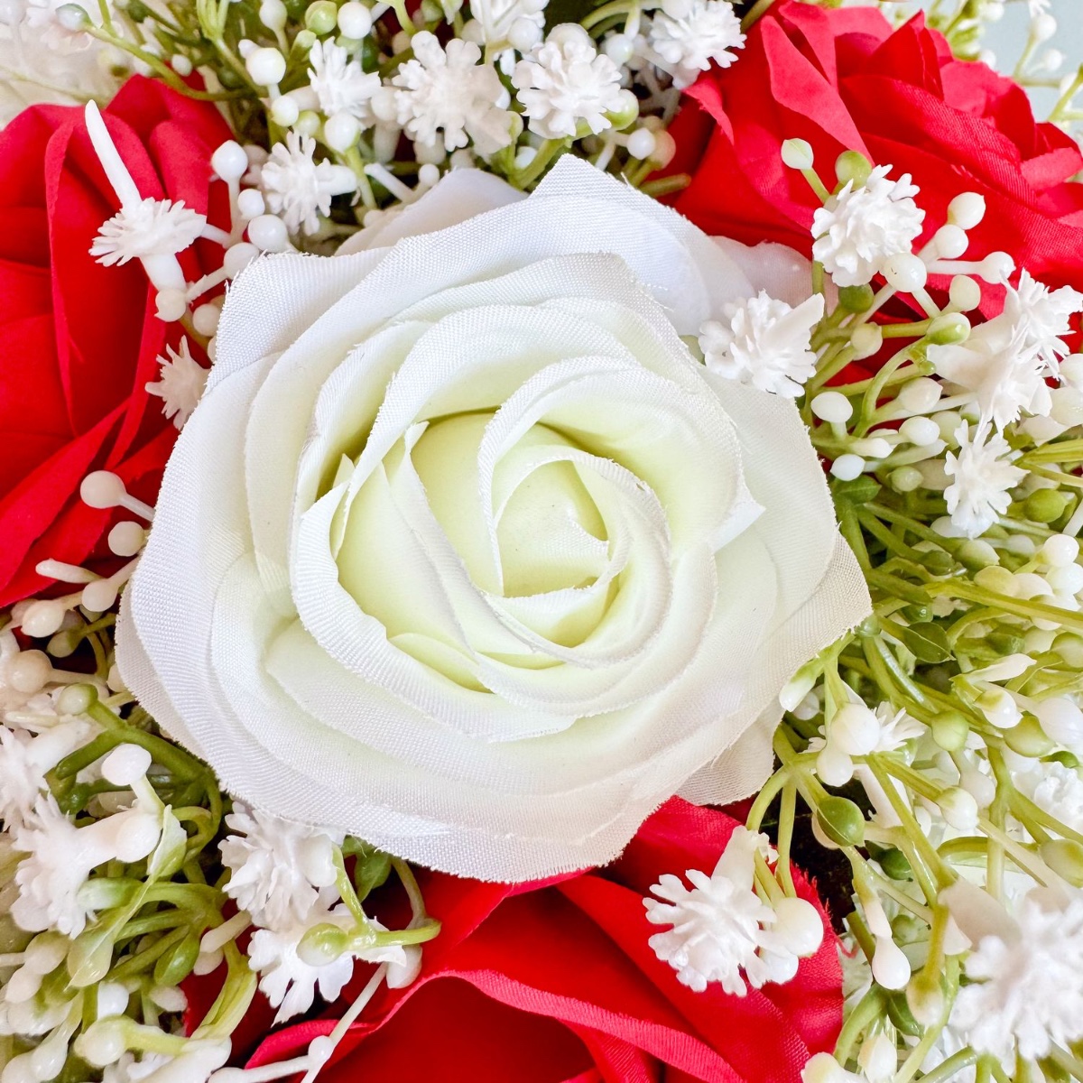 Aussi unique que votre « oui » ! Cet élégant bouquet de mariée en forme de goutte ou de cascade a été créé sur mesure selon les souhaits du client. L'harmonieuse combinaison de roses rouge vif et blanc pur, complétée par de fines branches de gypsophile et un feuillage vert intense, confère à cet arrangement un charme intemporel et raffiné. Le bouquet est élaboré avec beaucoup d'amour pour le détail. Sa forme incurvée crée des lignes fluides et naturelles, un accroche-regard élégant pour votre grand jour. Shop the Look !