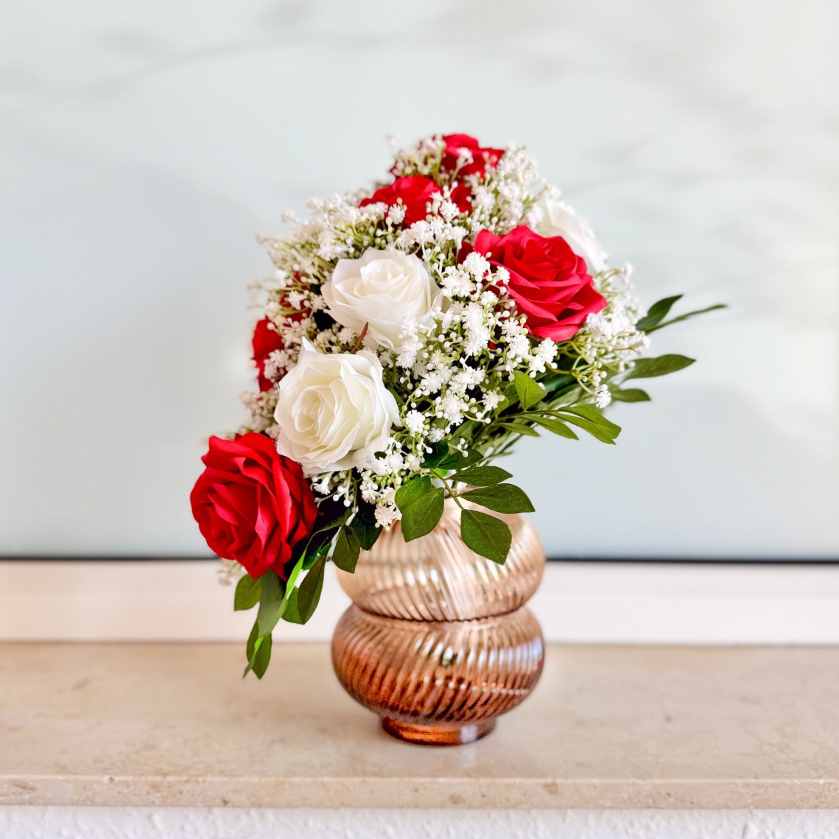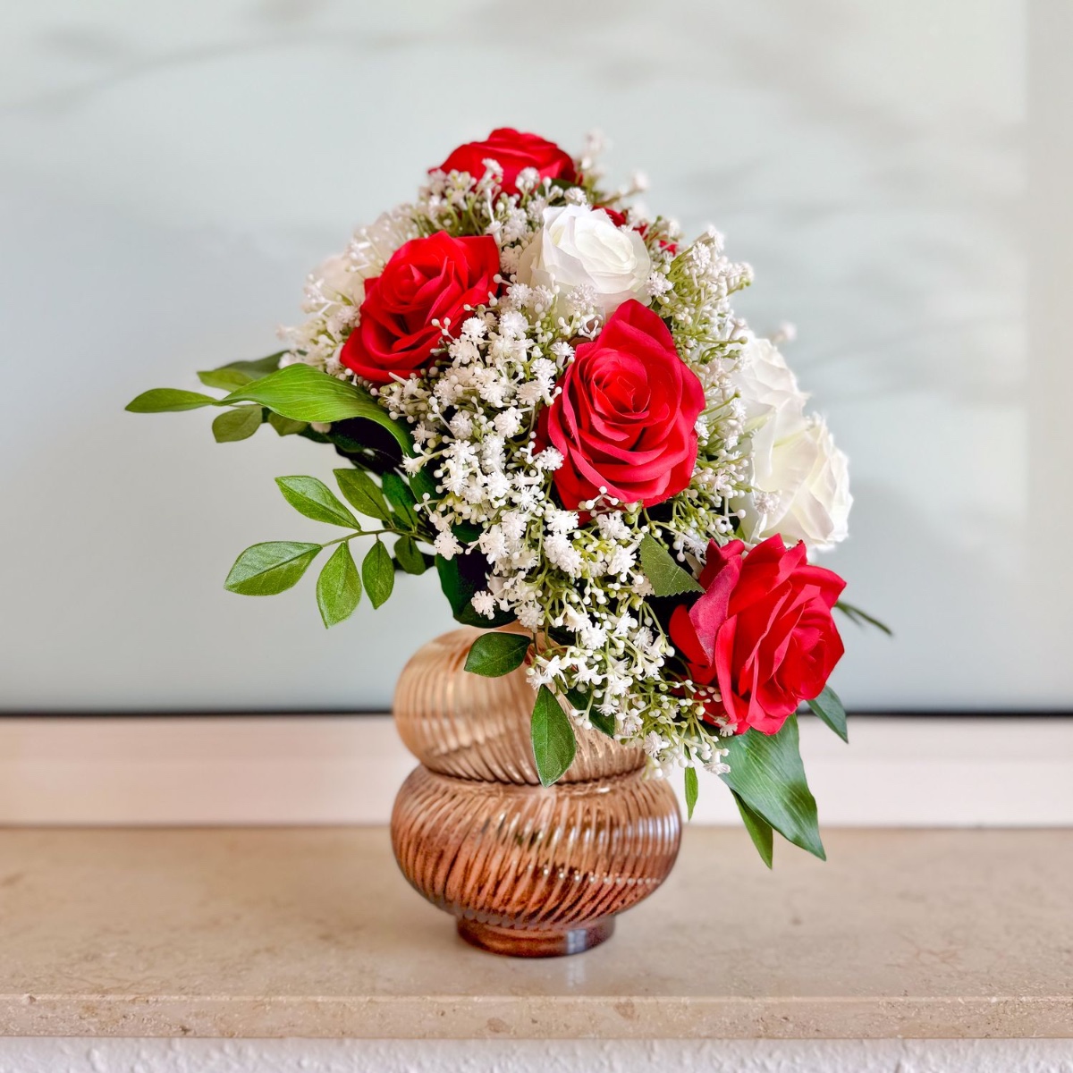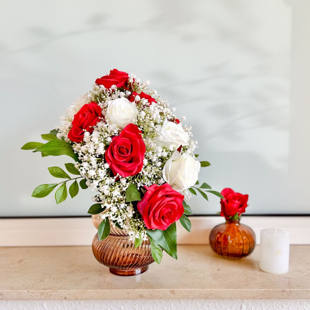 Aussi unique que votre « oui » ! Cet élégant bouquet de mariée en forme de goutte ou de cascade a été créé sur mesure selon les souhaits du client. L'harmonieuse combinaison de roses rouge vif et blanc pur, complétée par de fines branches de gypsophile et un feuillage vert intense, confère à cet arrangement un charme intemporel et raffiné. Le bouquet est élaboré avec beaucoup d'amour pour le détail. Sa forme incurvée crée des lignes fluides et naturelles, un accroche-regard élégant pour votre grand jour. Shop the Look !