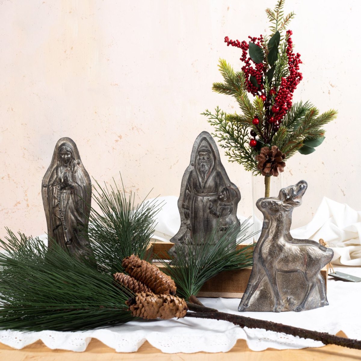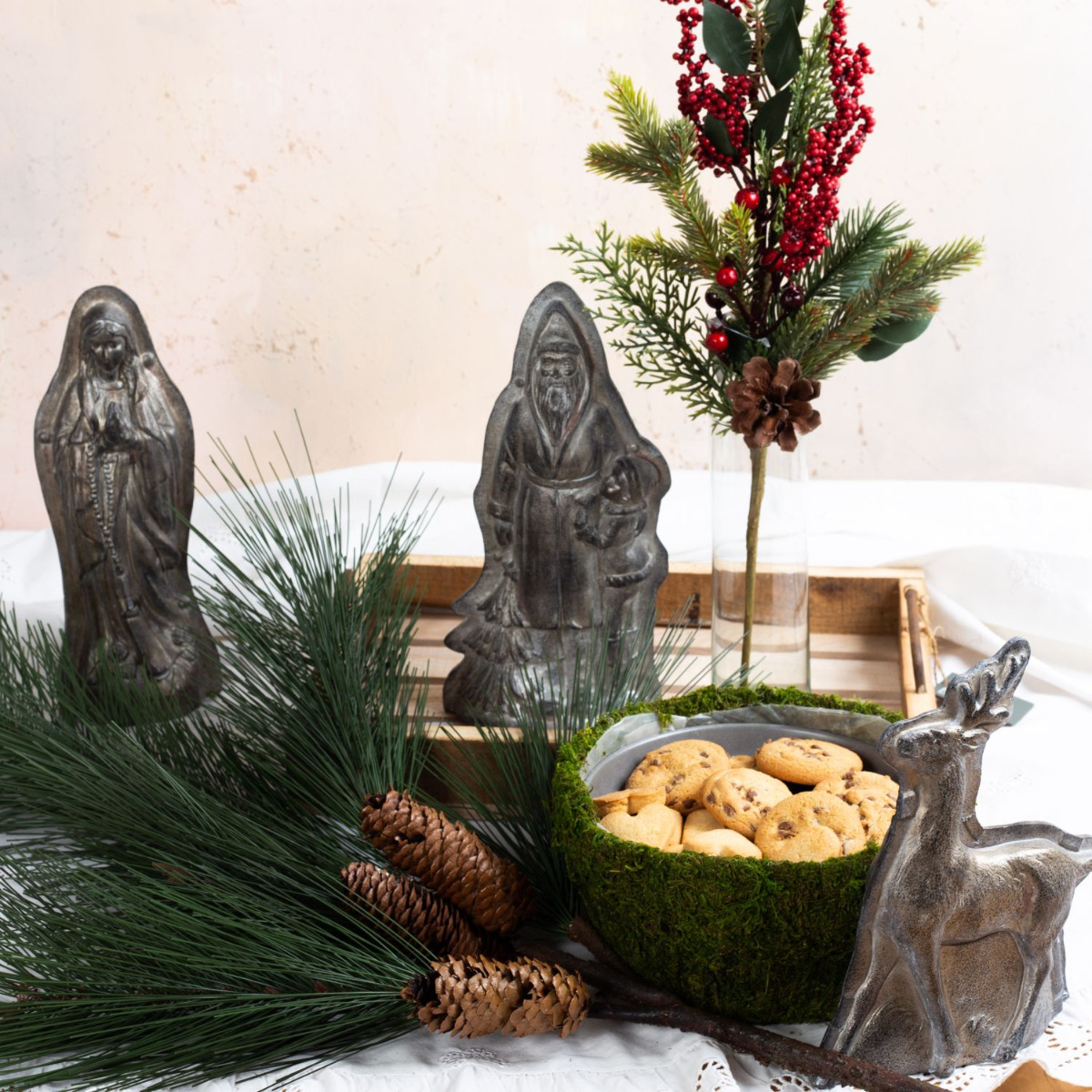 Décoration pour la période de Noël ! Décorez votre table basse ou votre buffet avec cet ensemble qui comblera tous vos souhaits. La branche de baies et la branche de sapin trouvent leur place dans le vase étroit. Le pot de fleurs en verre peut également être utilisé comme boîte à biscuits ou comme bougeoir. Vous pouvez ajuster la hauteur de votre bougie à l'aide d'une couche de granulés. Placez le vase ou le pot sur le plateau, que vous pouvez éventuellement recouvrir d'une serviette de Noël. Disposez ensuite les grandes branches devant pour décorer, et voilà un magnifique centre de table pour la période de l'Avent . Shop the Look !