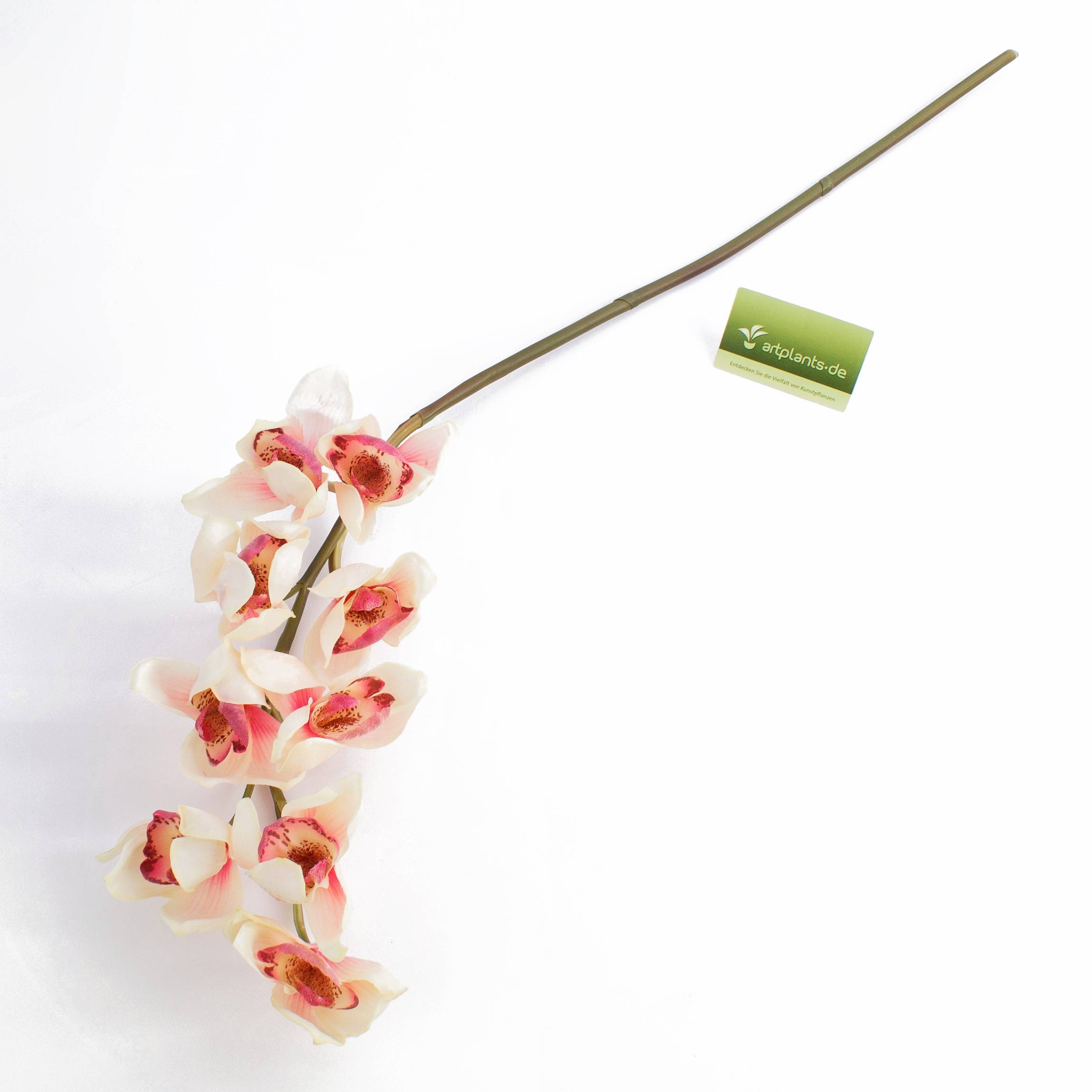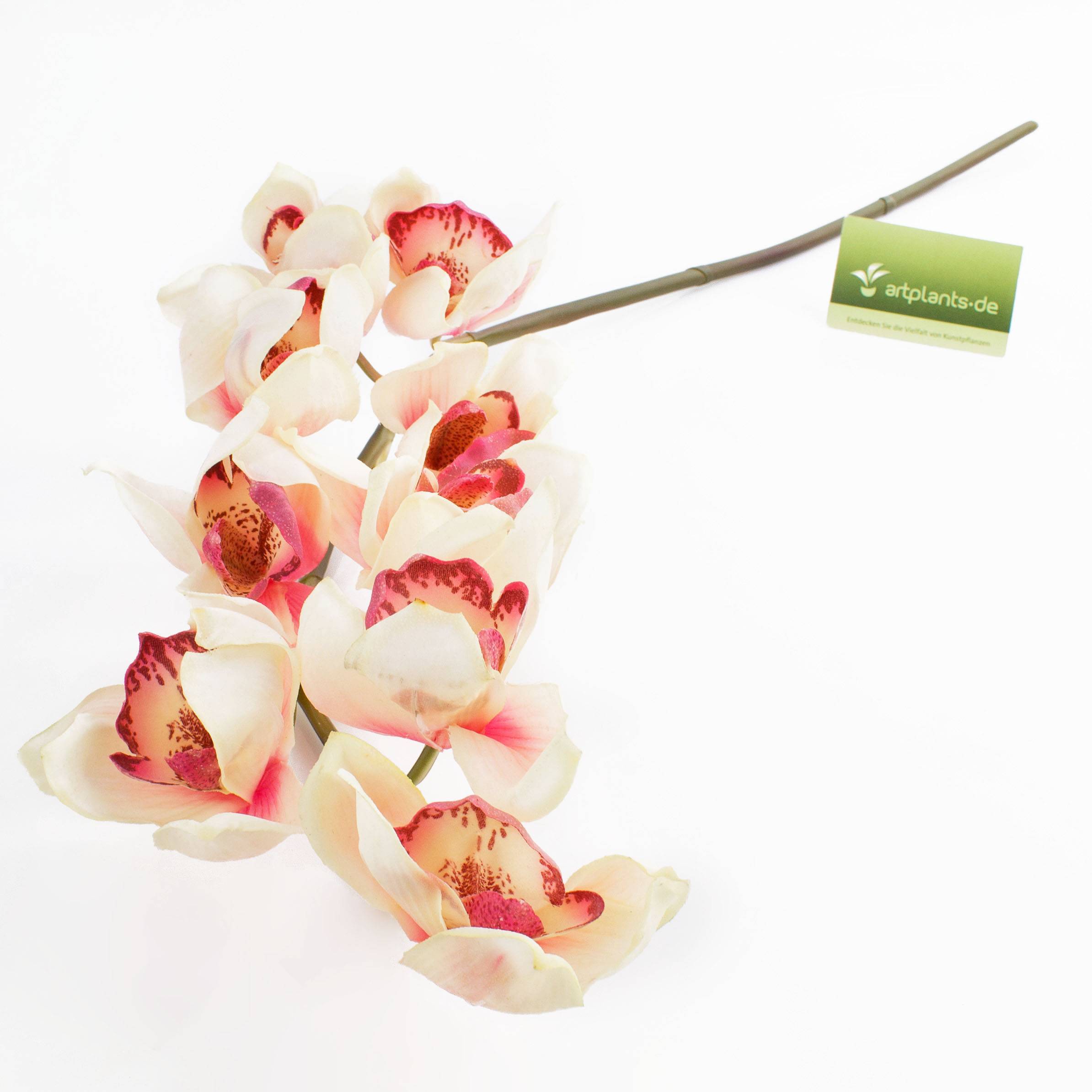 L'orchidée Cymidium artificielle est pourvue de 9 fleurs d'orchidées ouvertes de couleur crème-rose et un œil rose fuchsia. Cette tige de fleur artificielle mesure au total environ 80 cm de long.