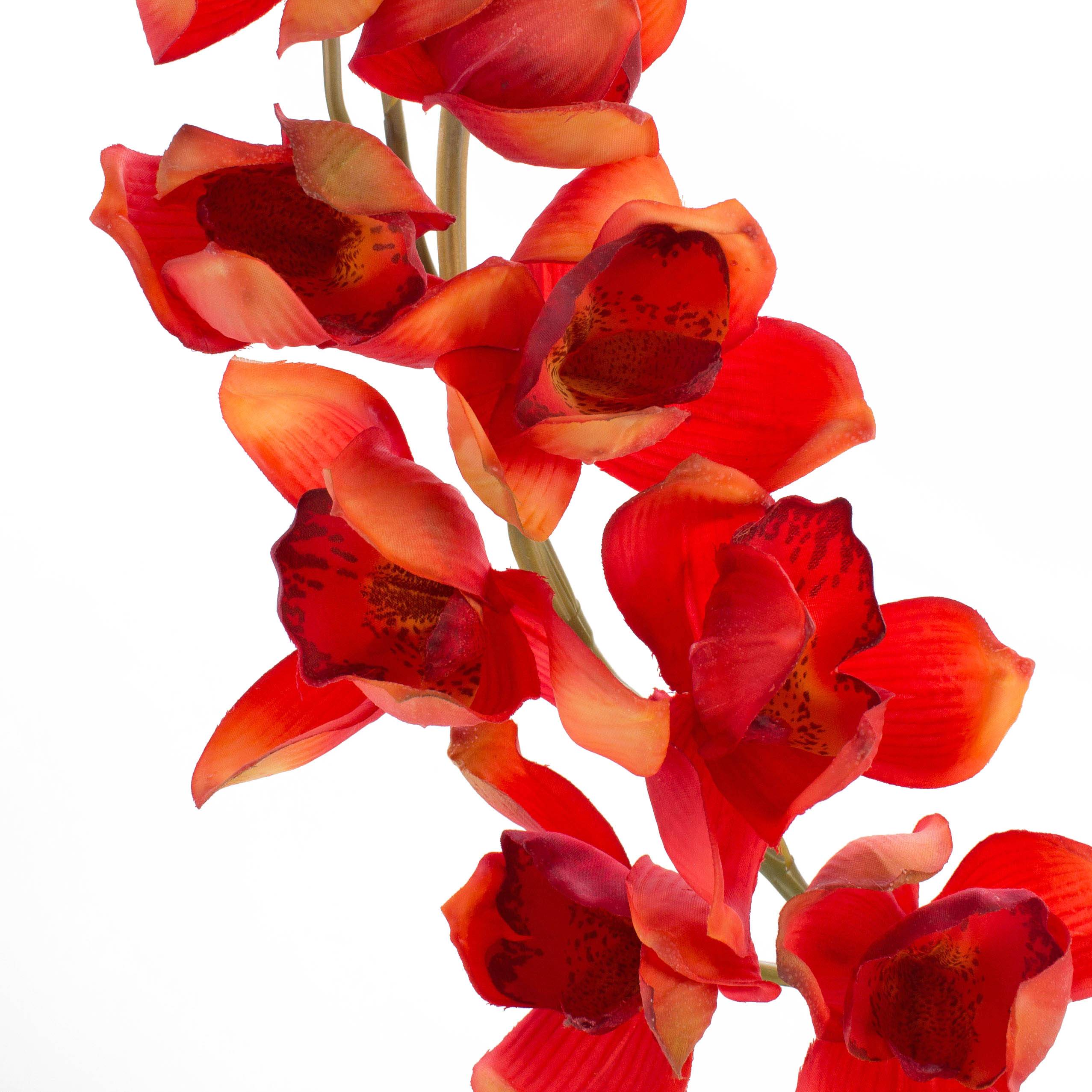 Cette tige d'orchidée Cymbidium artificielle est pourvue de 9 fleurs d'orchidées ouvertes de couleur rouge-orange. La branche de fleur artificielle mesure au total environ 90 cm de long.