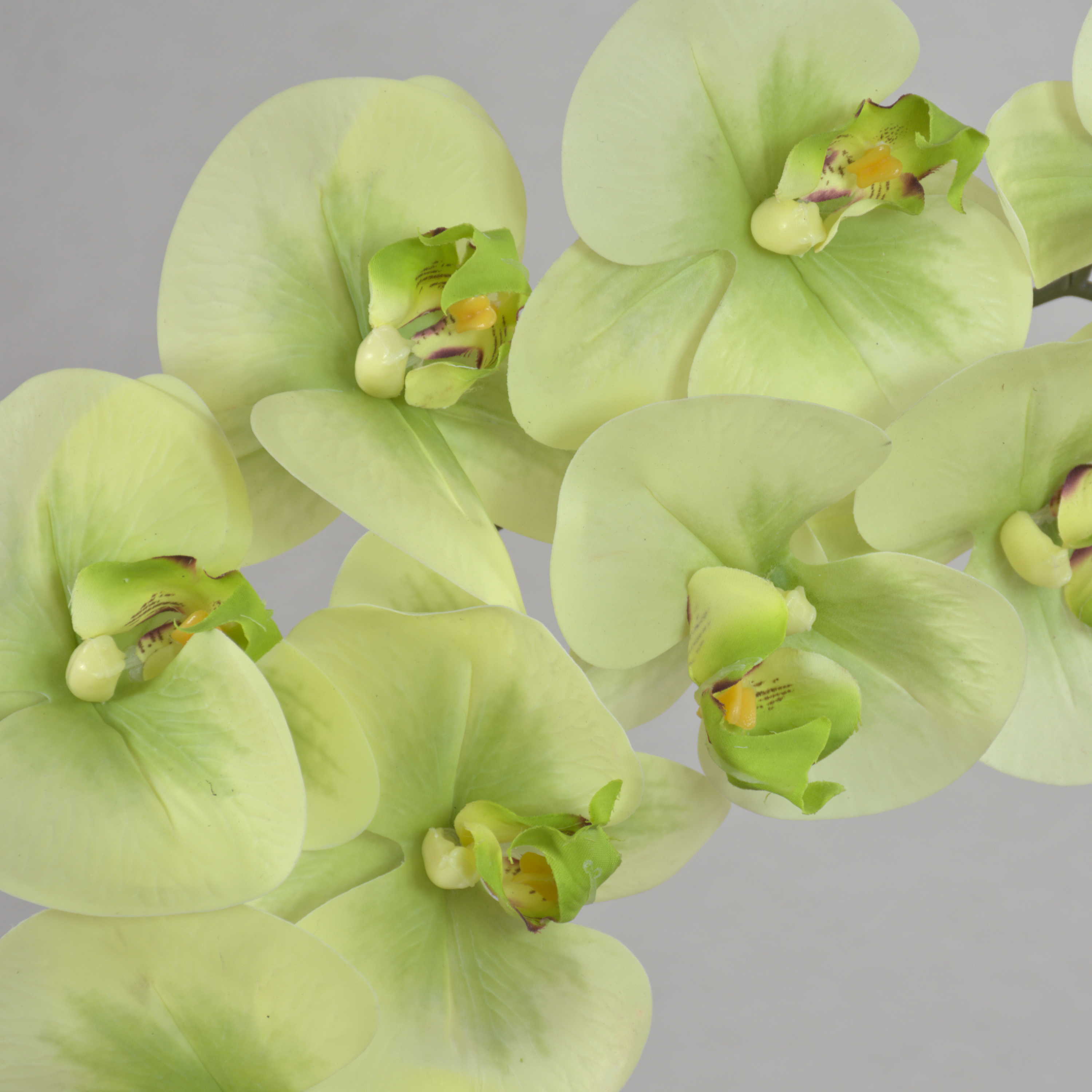 - Composée de 8 fleurs ouvertes (real touch) de couleur crème-vert avec un oeil vert-rouge et 3 boutons