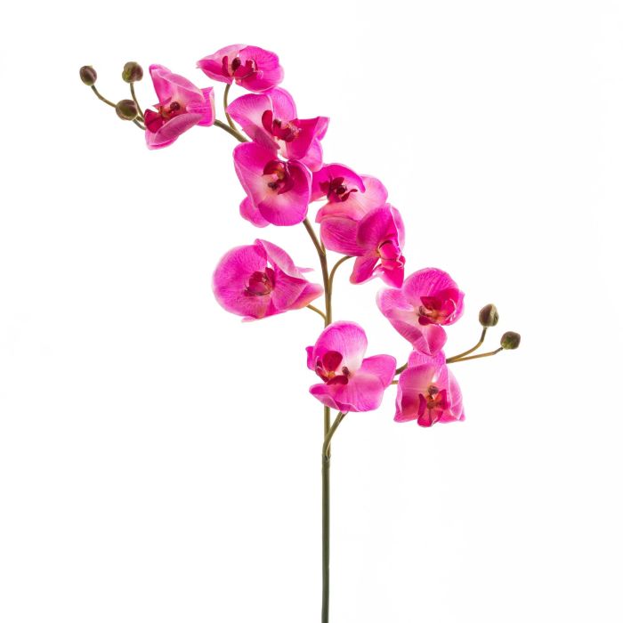 Tige d'orchidée Phalaenopsis artificielle pourvue de 10 fleurs d'orchidées de couleur violette et 5 boutons. Cette tige artificielle mesure au total environ 85 cm de long.