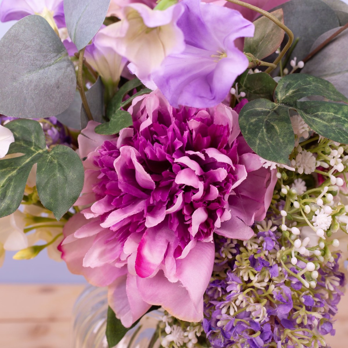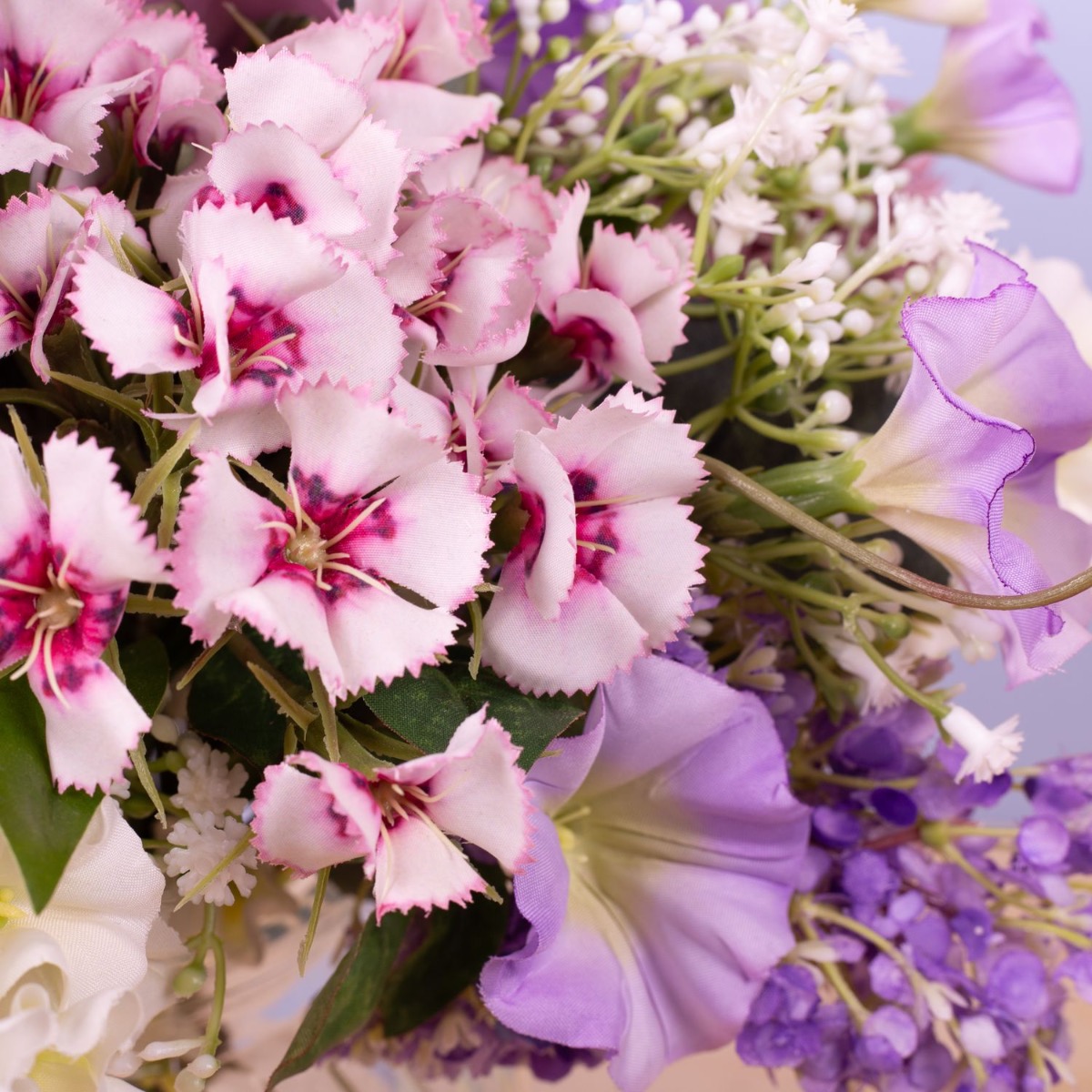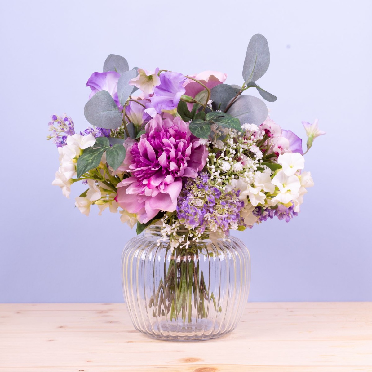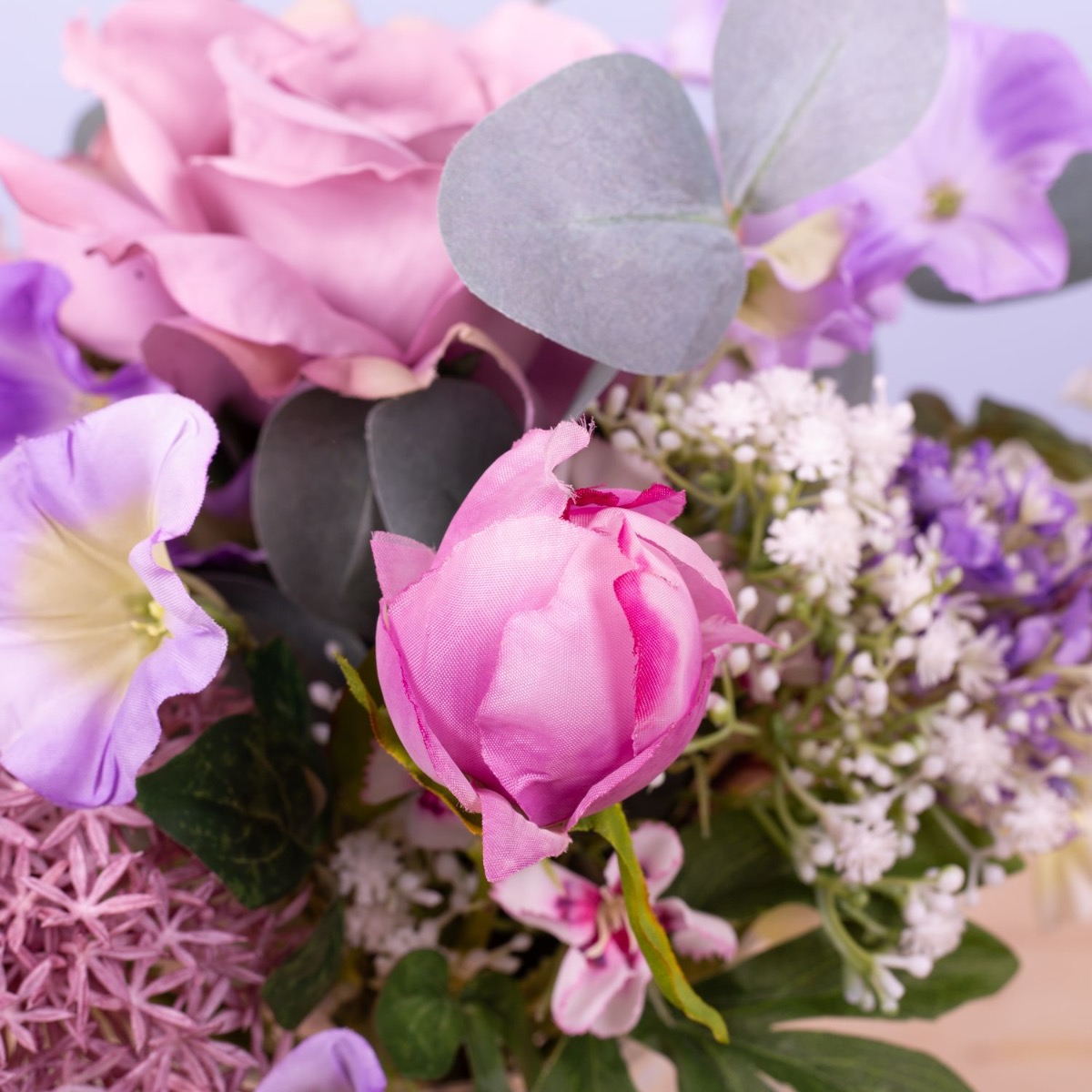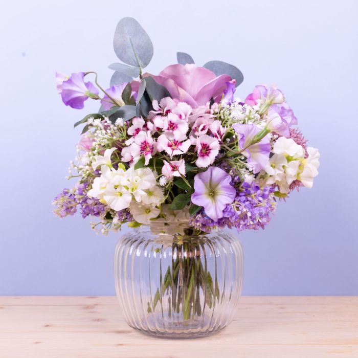 Des couleurs délicates et de jolies fleurs ! Ce petit bouquet est tout simplement adorable et constitue toujours un cadeau approprié à offrir à une personne chère. Rose, œillet de poète, pivoine, allium, ipomée, branches d'eucalyptus, phlox blanc, gypsophile délicat et lilas violet tendre ont été liés en un mini-bouquet qui s'adapte parfaitement au petit vase bombé. Ce petit bouquet est également une décoration de table parfaite pour les mariages ou autres festivités, car il n'obstrue pas la vue de son vis-à-vis. Shop the Look!