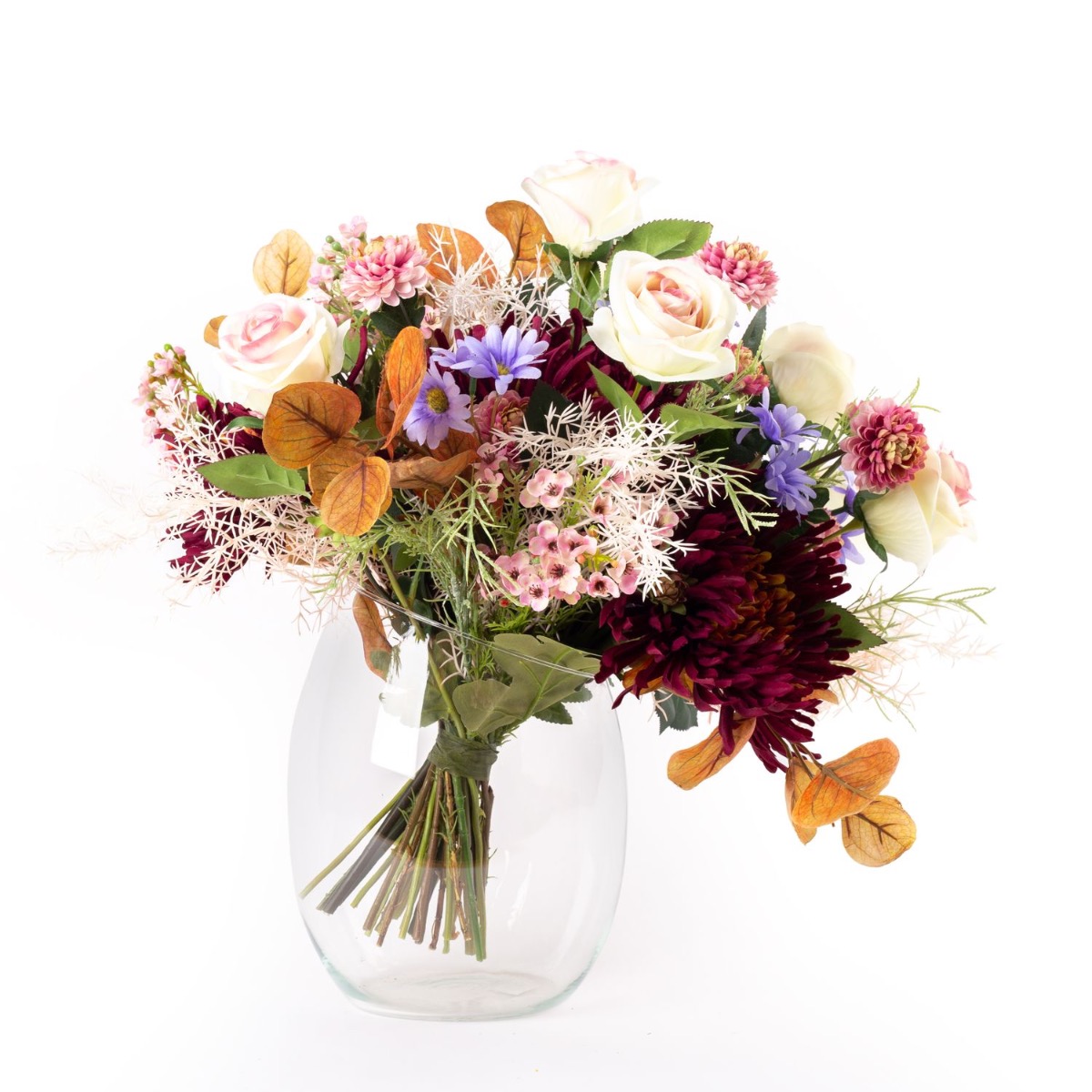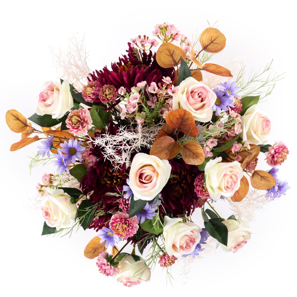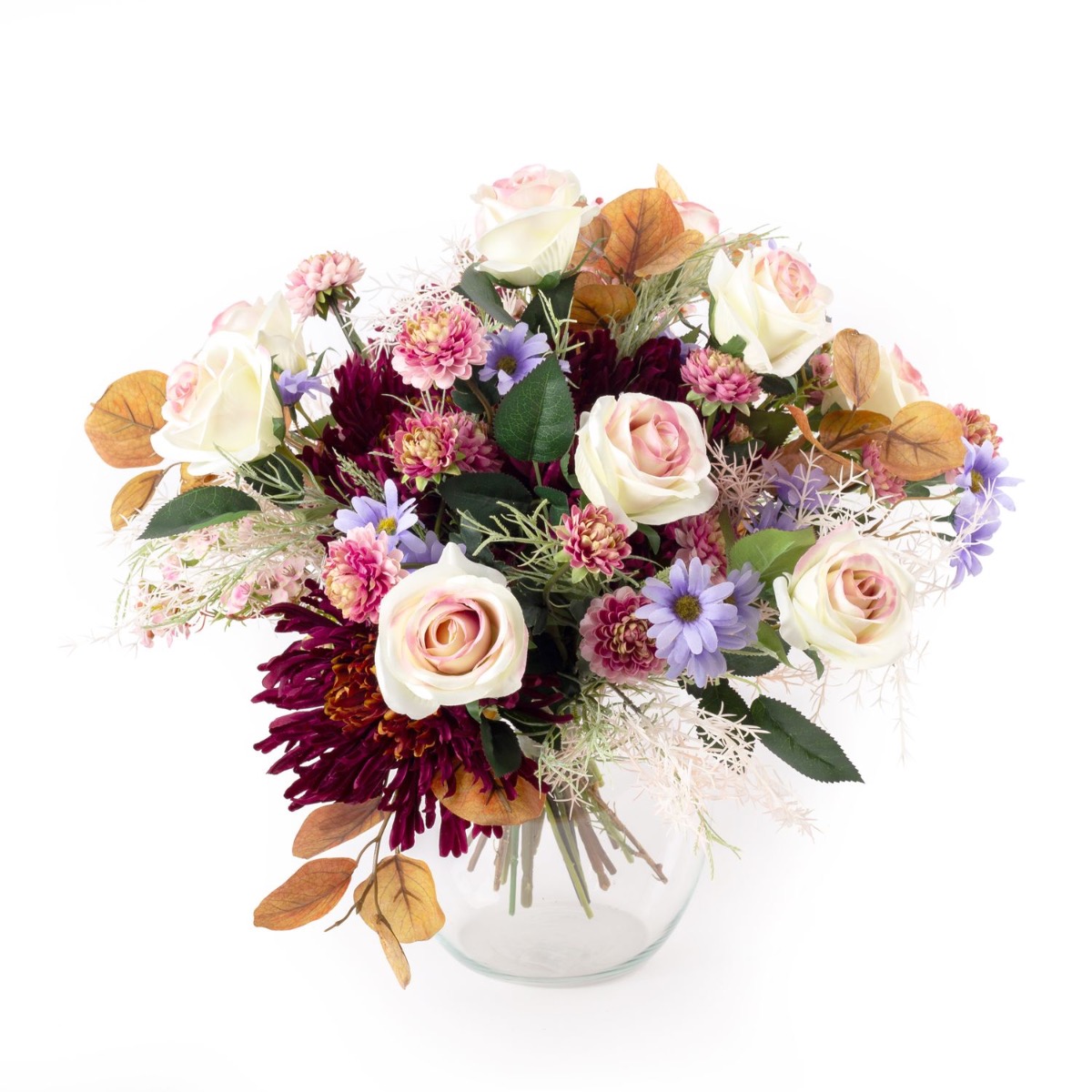 Des roses nobles en rose-crème, des chrysanthèmes luxuriants en violet foncé, des chrysanthèmes fins en rose, ainsi que des accessoires composés de marguerites bleu-lilas, de fleurs de cire roses, de fines branches d'herbe et de branches d'eucalyptus automnales