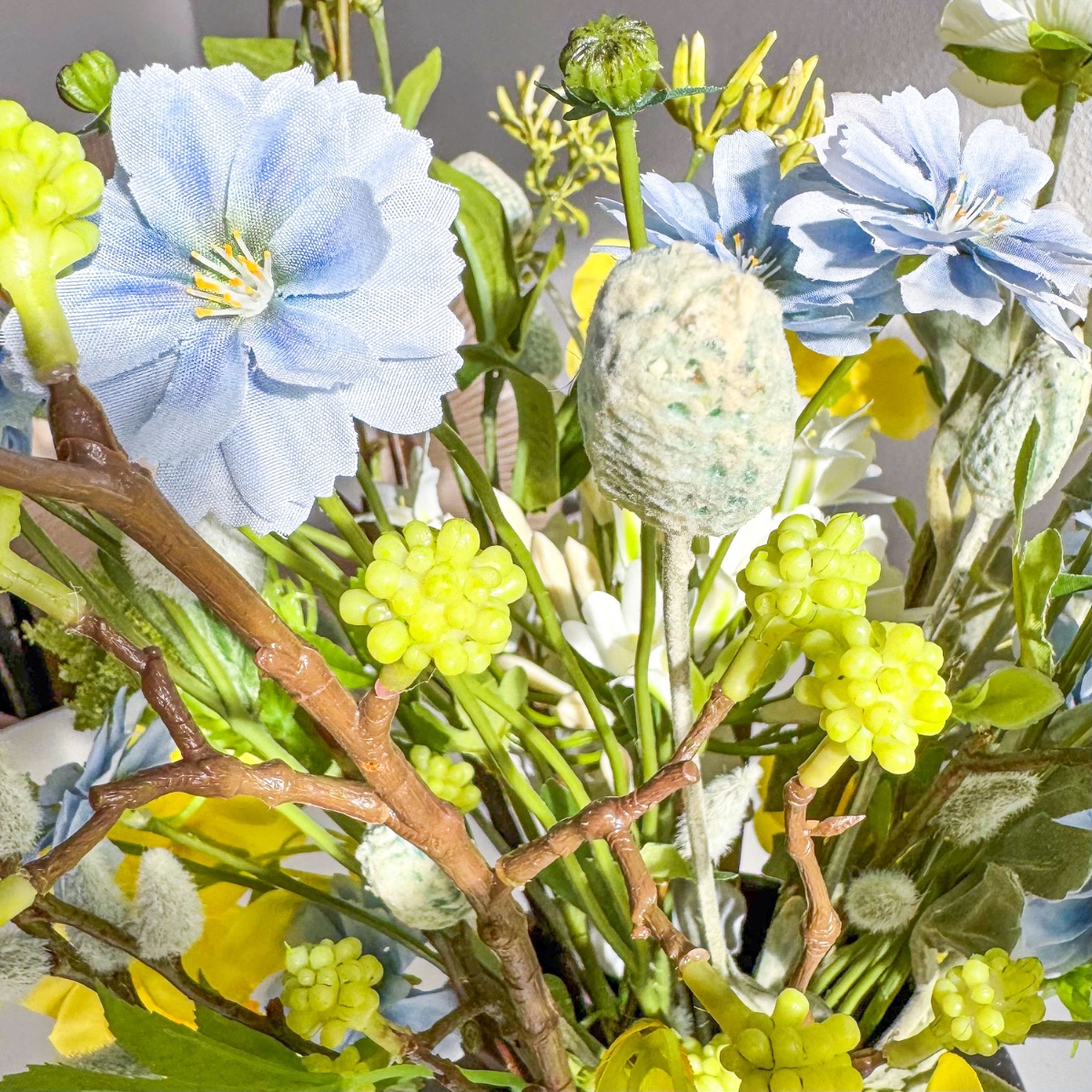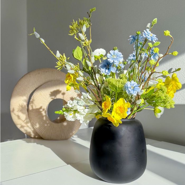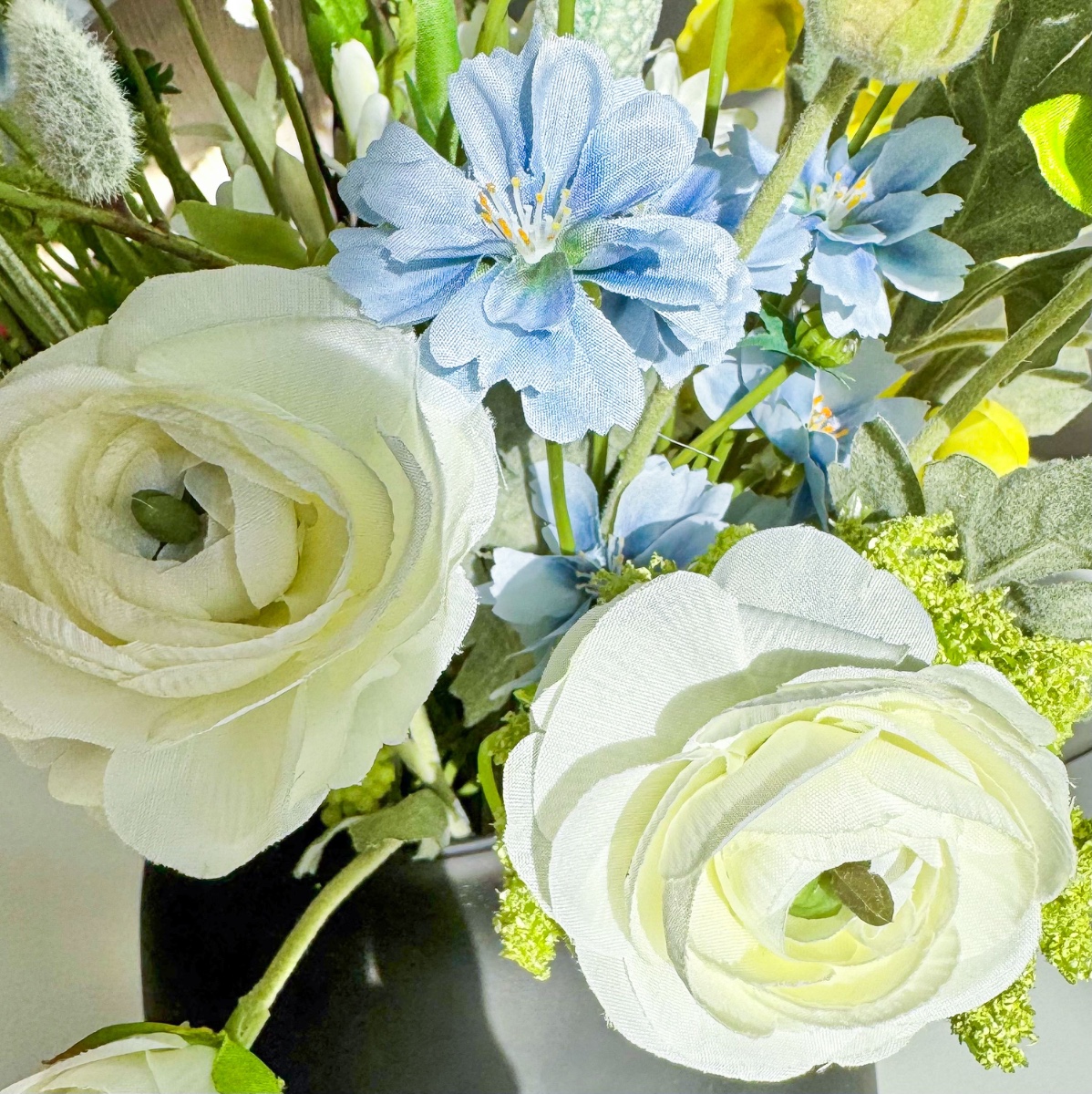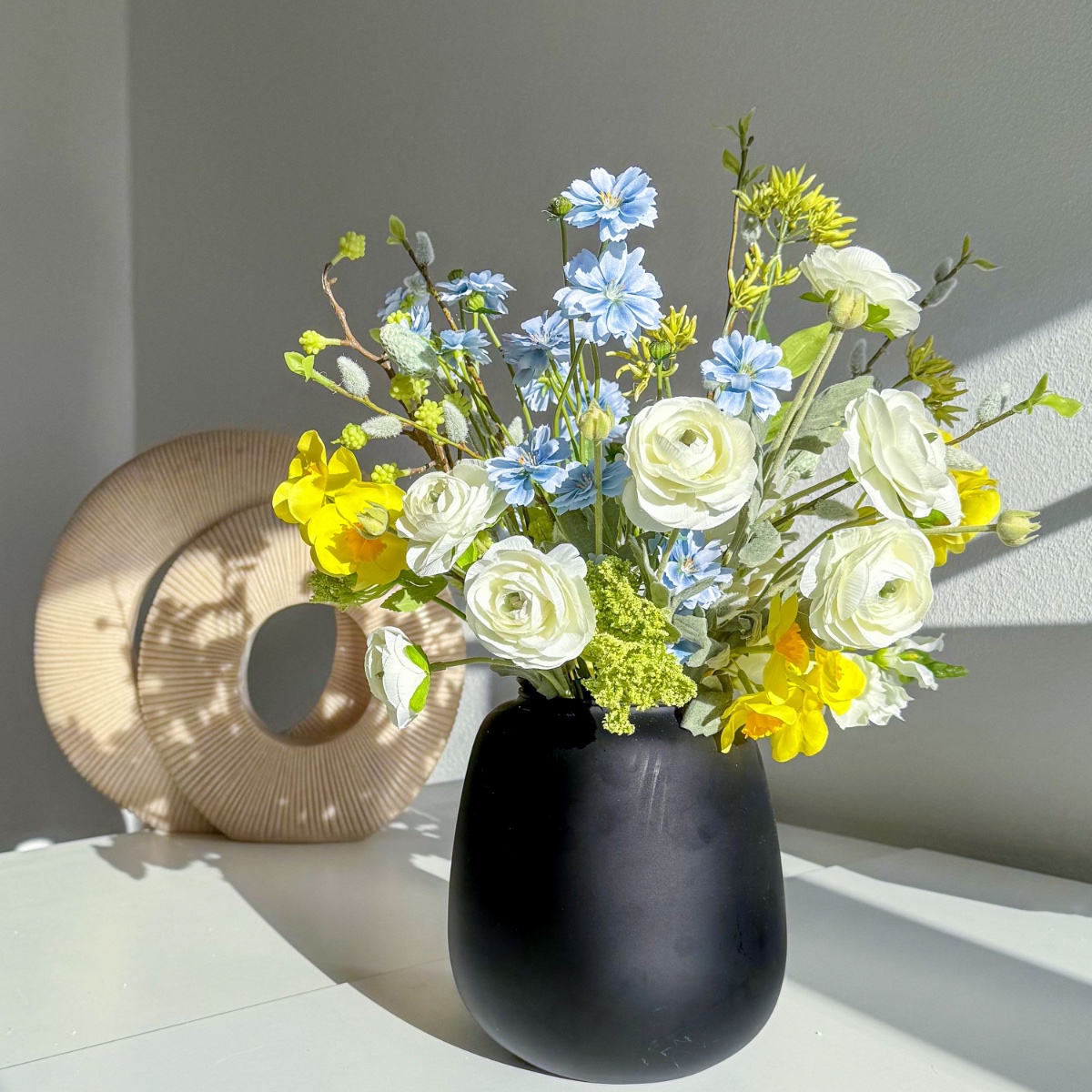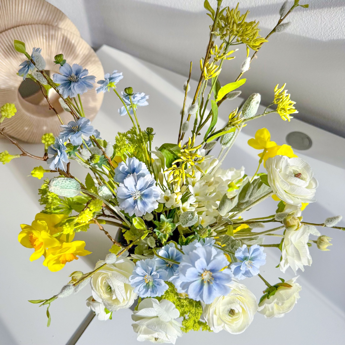 Quand le printemps prend forme ! Ce bouquet a été créé d'après une photo dont notre cliente est immédiatement tombée amoureuse. Réalisé avec beaucoup de délicatesse, cet arrangement a été reproduit aussi fidèlement que possible, en parfaite harmonie avec le vase indiqué. En accord avec la saison printanière et Pâques, il allie une fraîcheur légère à des touches ludiques et saisonnières. Le bouquet tire sa vitalité de sa composition délibérément aérée : les fleurs sont disposées à différentes hauteurs, créant ainsi une image d'ensemble vivante, presque dansante. Tandis que des renoncules blanches et des jonquilles d'un jaune éclatant rayonnent dans la partie inférieure et médiane, des centaurées bleues s'étendent de manière ludique à travers tous les niveaux et relient les différentes zones entre elles – comme un salut printanier haut en couleur. Dans la partie inférieure, des agapanthes blanches apportent volume et sérénité au centre, tandis qu’une muflier blanc délicatement retombant confère à la composition une note douce et fluide. Des carottes sauvages d’un vert frais aèrent la composition et introduisent une structure naturelle, presque sauvage. Vers le haut, le bouquet devient de plus en plus aérien : des cornouillers, des boutons de bleuet et des chatons de saule s’élèvent librement et apportent des accents fins et graphiques – typiques de la nature qui s’éveille au printemps. Au centre, des boutons de chardon dansent comme de petits œufs de Pâques entre les fleurs et reprennent l’esprit de Pâques de manière discrète et élégante. La forme du bouquet est particulièrement caractéristique : il n’est pas lié de manière classique en rond, mais présente un tracé captivant – légèrement surélevé à gauche et à droite, tandis que le centre est délibérément maintenu un peu plus bas. Cette silhouette confère à la composition une dynamique moderne et naturelle et en fait une pièce véritablement unique. Un bouquet de printemps réalisé sur mesure qui capture la légèreté de la saison. Faites entrer le printemps chez vous. Shop the Look!