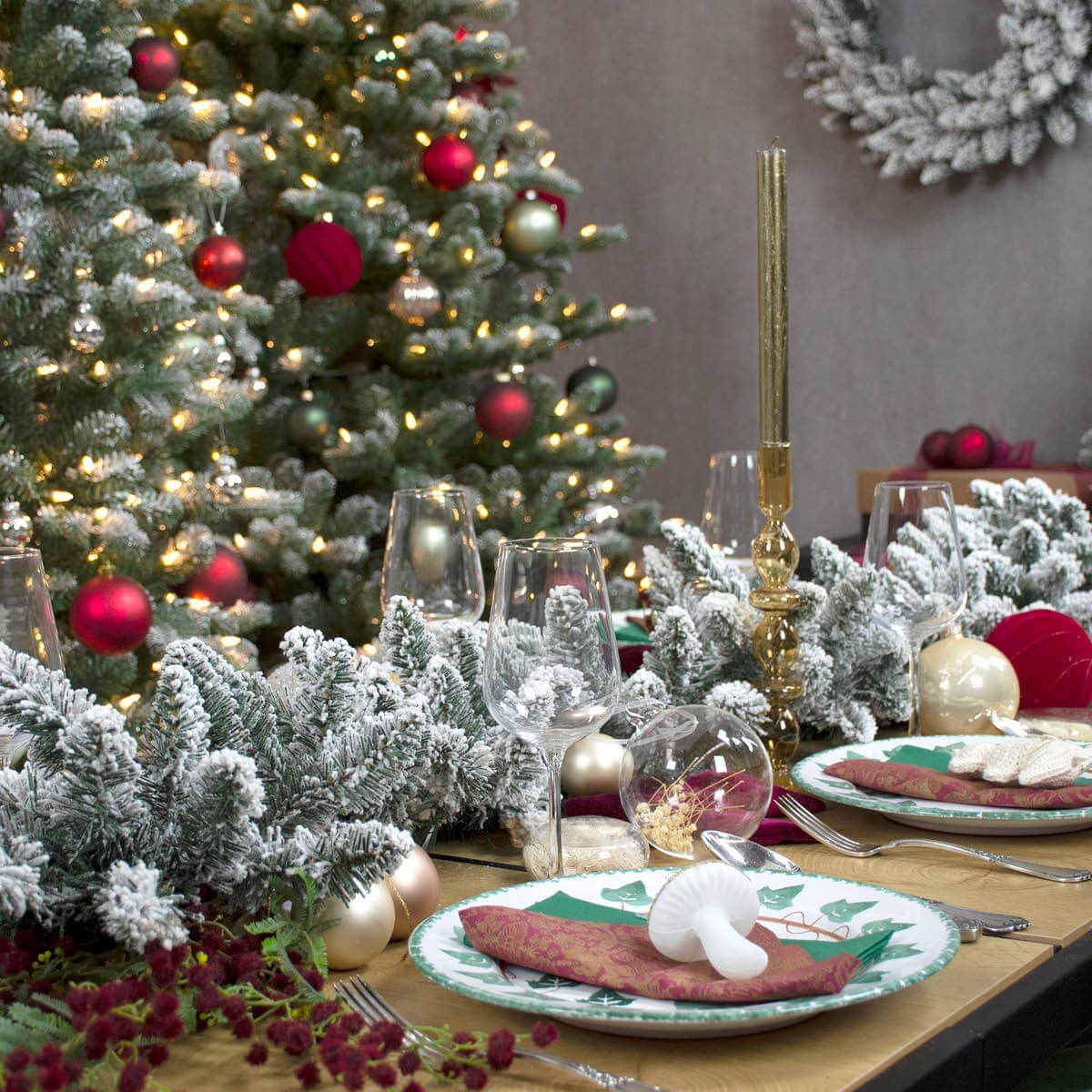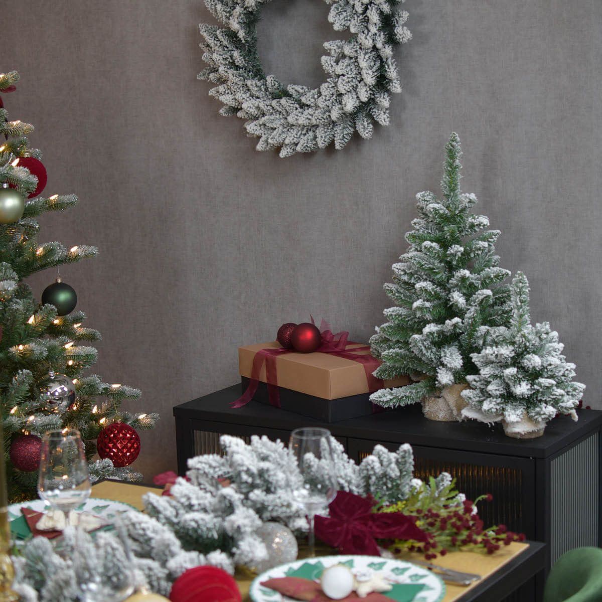 Conseil de décoration : misez sur les contrastes : décorez le grand sapin enneigé avec des boules rouges et argentées brillantes et disposez la table à manger de manière assortie avec une guirlande de sapin, des branches de baies rouges et des boules de Noël – cela crée de la profondeur et une ambiance festive. Complétez l'ensemble avec des bougies ou des guirlandes lumineuses blanc chaud pour créer une image harmonieuse et une atmosphère de Noël chaleureuse et élégante.
