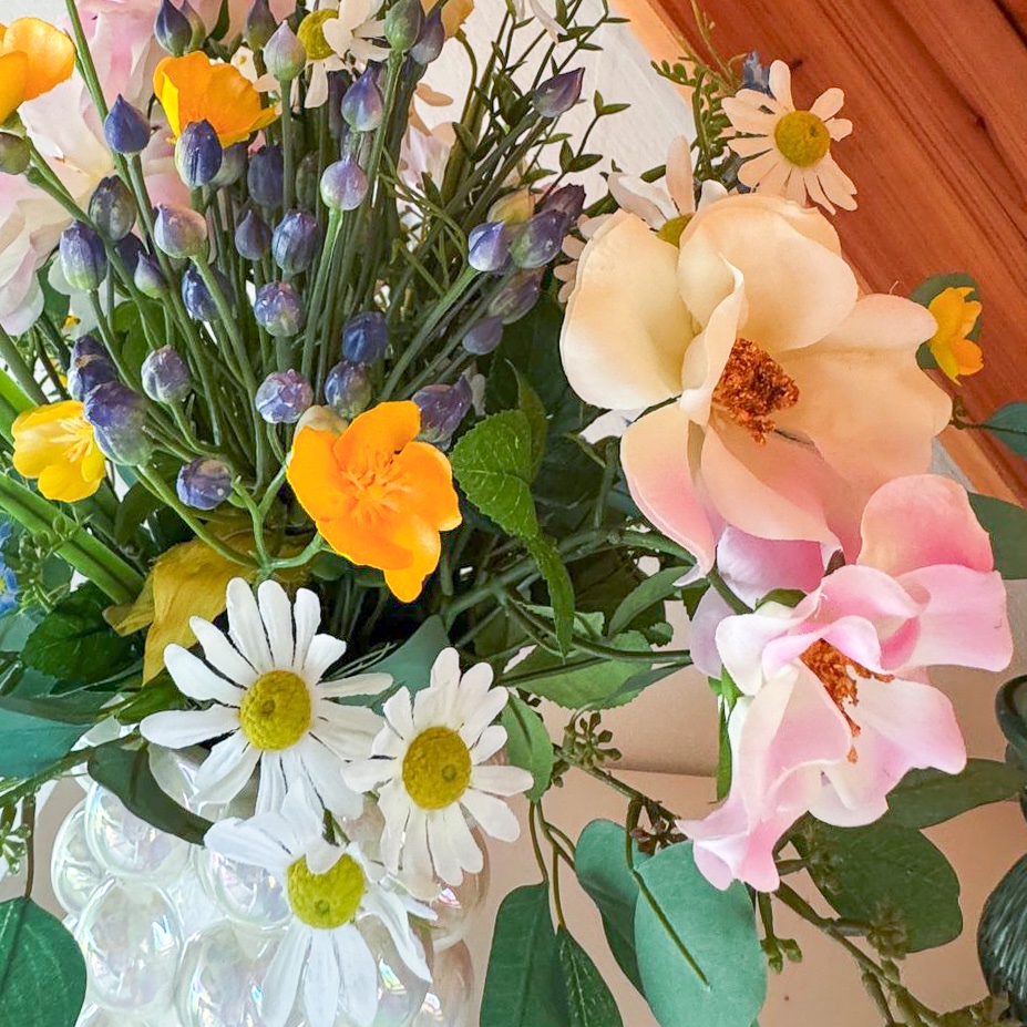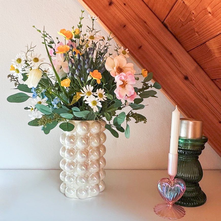 Une touche estivale qui apporte calme et beauté à chaque pièce ! Ce bouquet artificiel apporte l'élégance décontractée d'une chaude journée d'été directement dans votre intérieur, sans le caractère éphémère des fleurs naturelles. Les roses sauvages roses confèrent à l'ensemble une atmosphère douce, tandis que la camomille qui les entoure crée une sensation de calme naturel. Les campanules blanches s'étirent délicatement et confèrent au bouquet une note claire, presque minimaliste, qui est agréablement adoucie par le jaune délicat des boutons d'or. Une touche de modernité est ajoutée par les bourgeons d'ail décoratif bleu, dont la forme claire donne de la structure au bouquet. De délicates fleurs de myosotis se nichent entre elles et apportent une touche de couleur légère et discrète. Le tout est encadré par des branches d'eucalyptus et de troène, qui confèrent au bouquet une silhouette calme et équilibrée, parfaite pour tous ceux qui aiment le look naturel, mais souhaitent renoncer aux fleurs véritables. Shop the Look!