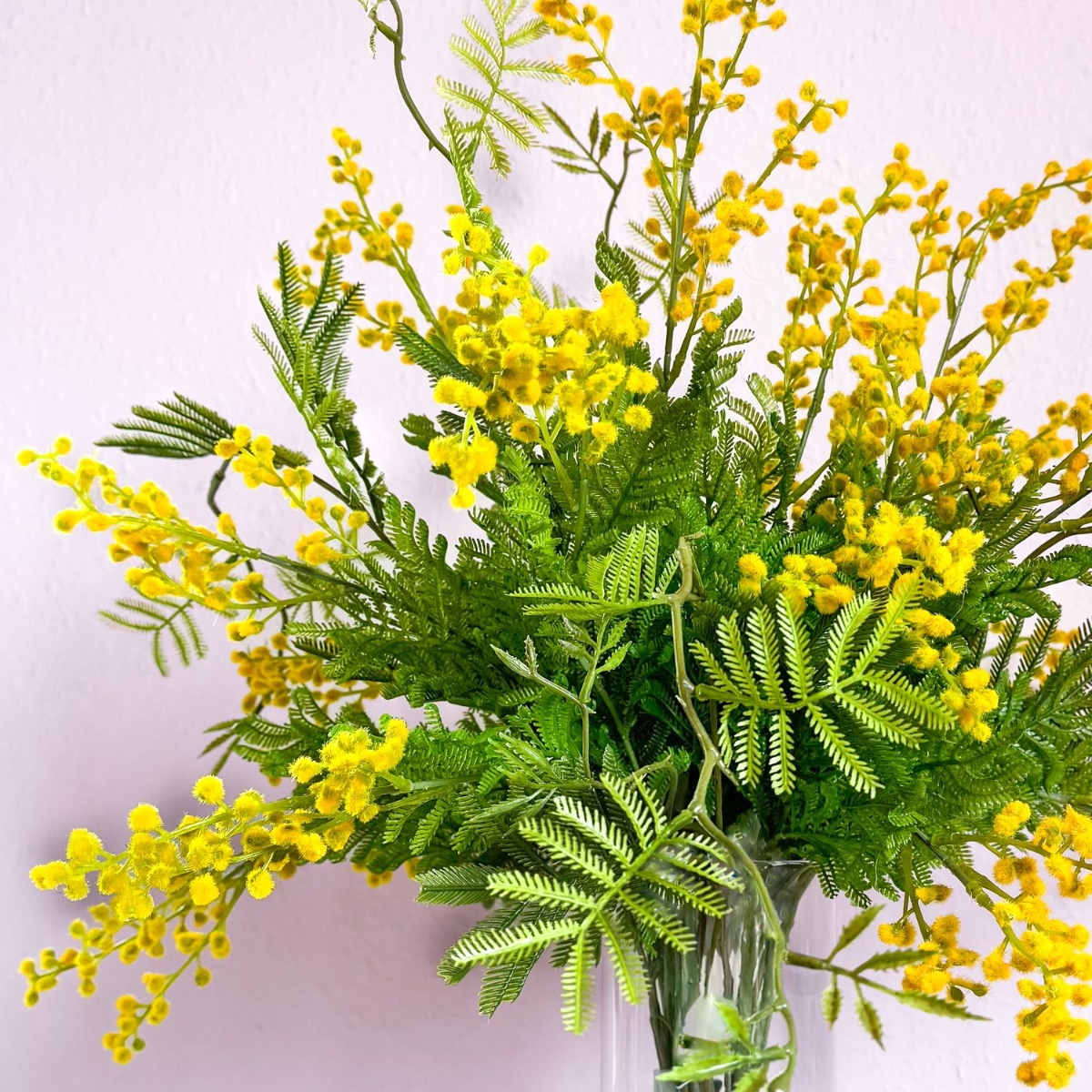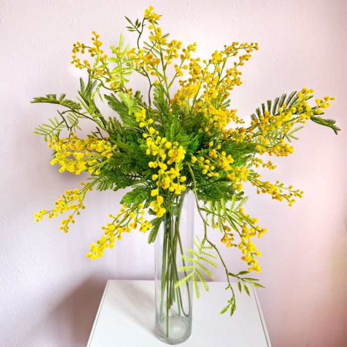 Une touche de soleil – la légèreté de la nature dans votre intérieur ! Ce bouquet de mimosa rayonne de pure légèreté et de joie de vivre. Les feuilles filigranes en forme de plumes d'un vert frais forment un contraste harmonieux avec les petites fleurs jaunes lumineuses qui ressemblent à des rayons de soleil. Disposé dans un vase en verre haut et sobre, l'élégance naturelle du mimosa est parfaitement mise en valeur. Le bouquet est frais, vivant et délicat à la fois, idéal pour apporter une touche joyeuse et ensoleillée à n'importe quelle pièce. Un véritable accroche-regard qui apporte le printemps et la chaleur dans votre intérieur. Shop the Look!